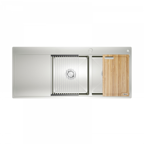KN11650TD là mẫu chậu rửa đặc biệt trong bộ sưu tập Workstation handmade của Konox – độc quyền tích hợp bàn chờ kết hợp cùng thiết kế hạ bậc, đem lại trải nghiệm nấu nướng đầy cảm hứng và đầy đủ tiện ích.