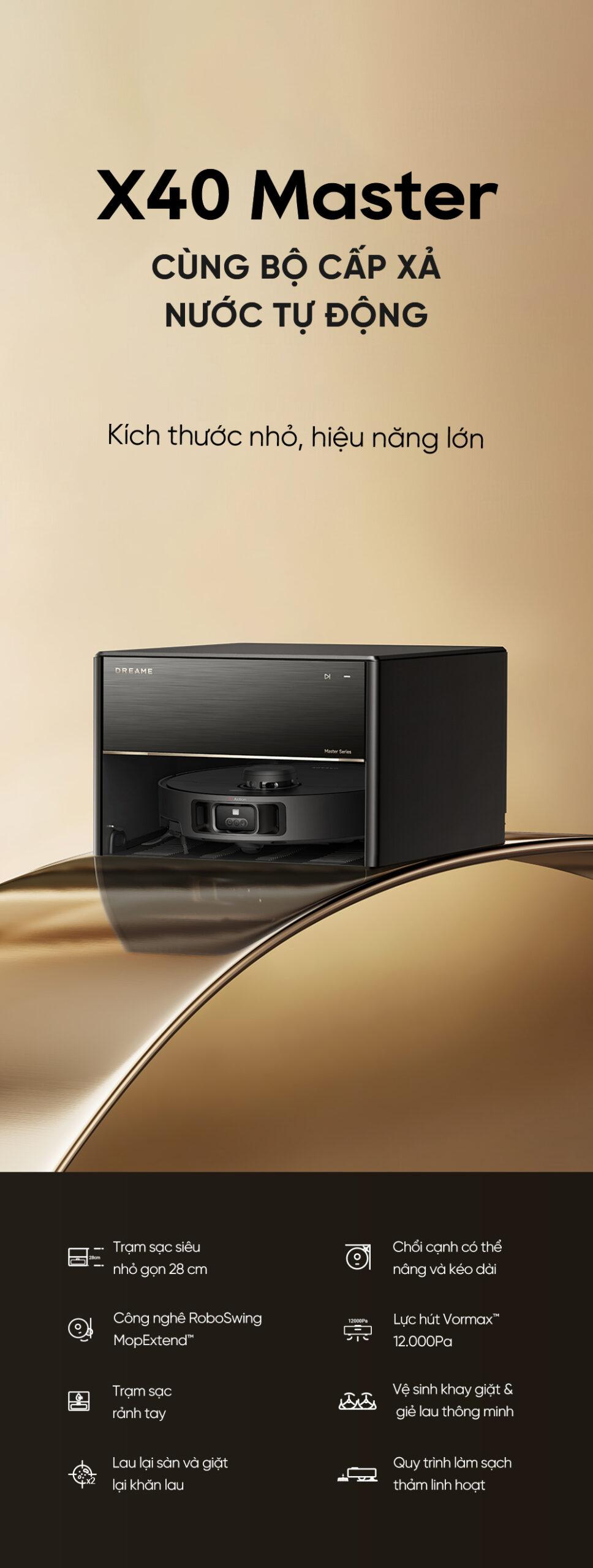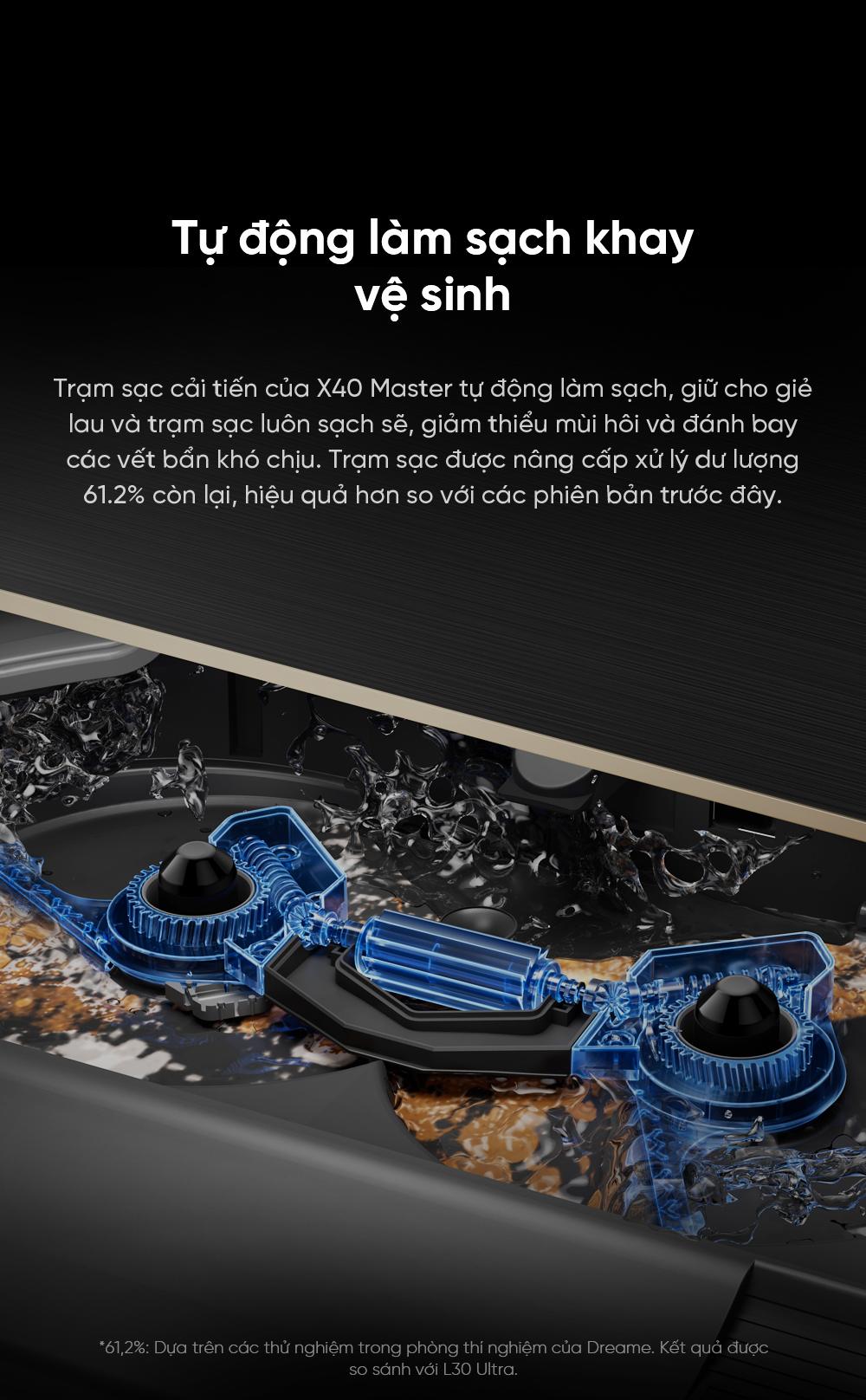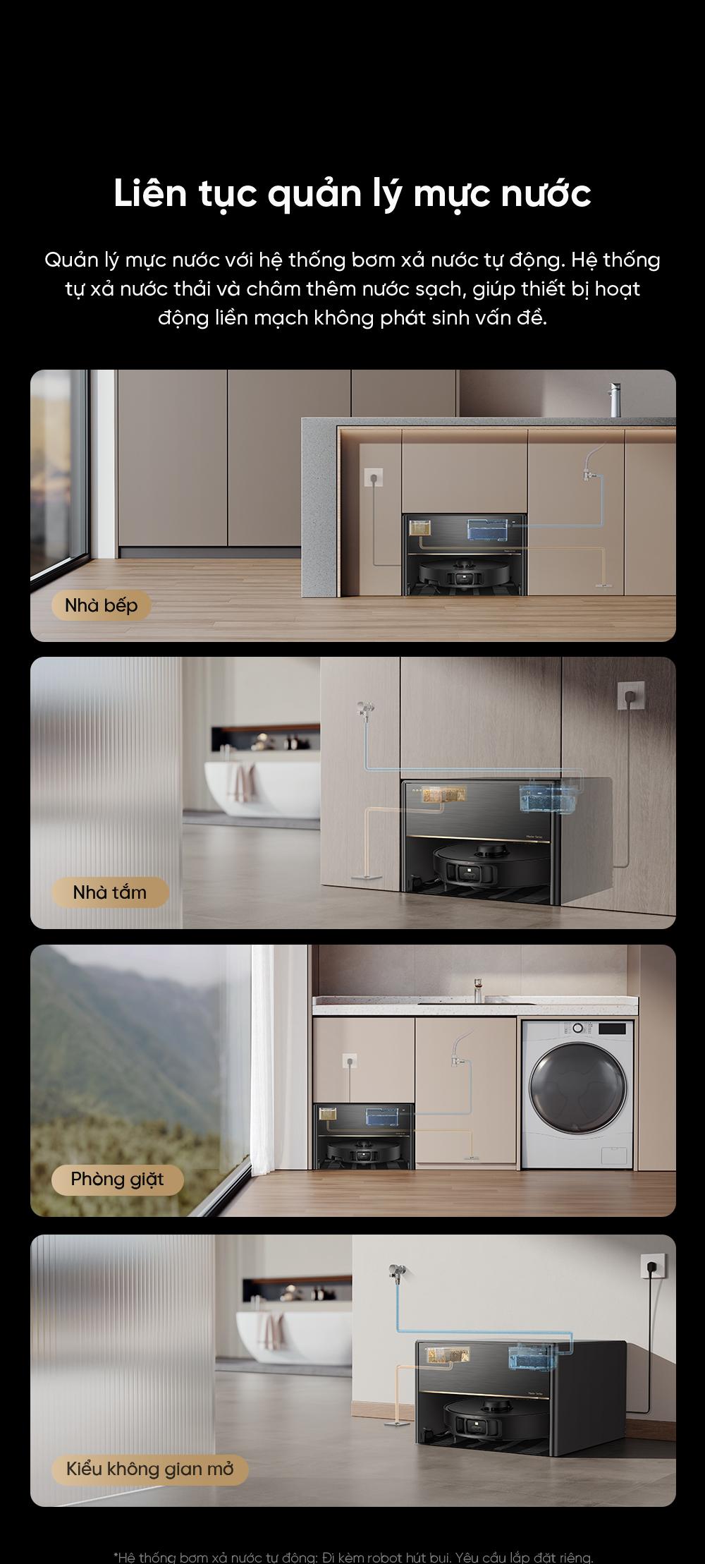 | Trạm cấp xả nước tự động | Có, trạm All-in-One với bồn nước sạch 4.5L và bồn nước bẩn 4L, tự động cấp nước sạch và xả nước bẩn. |