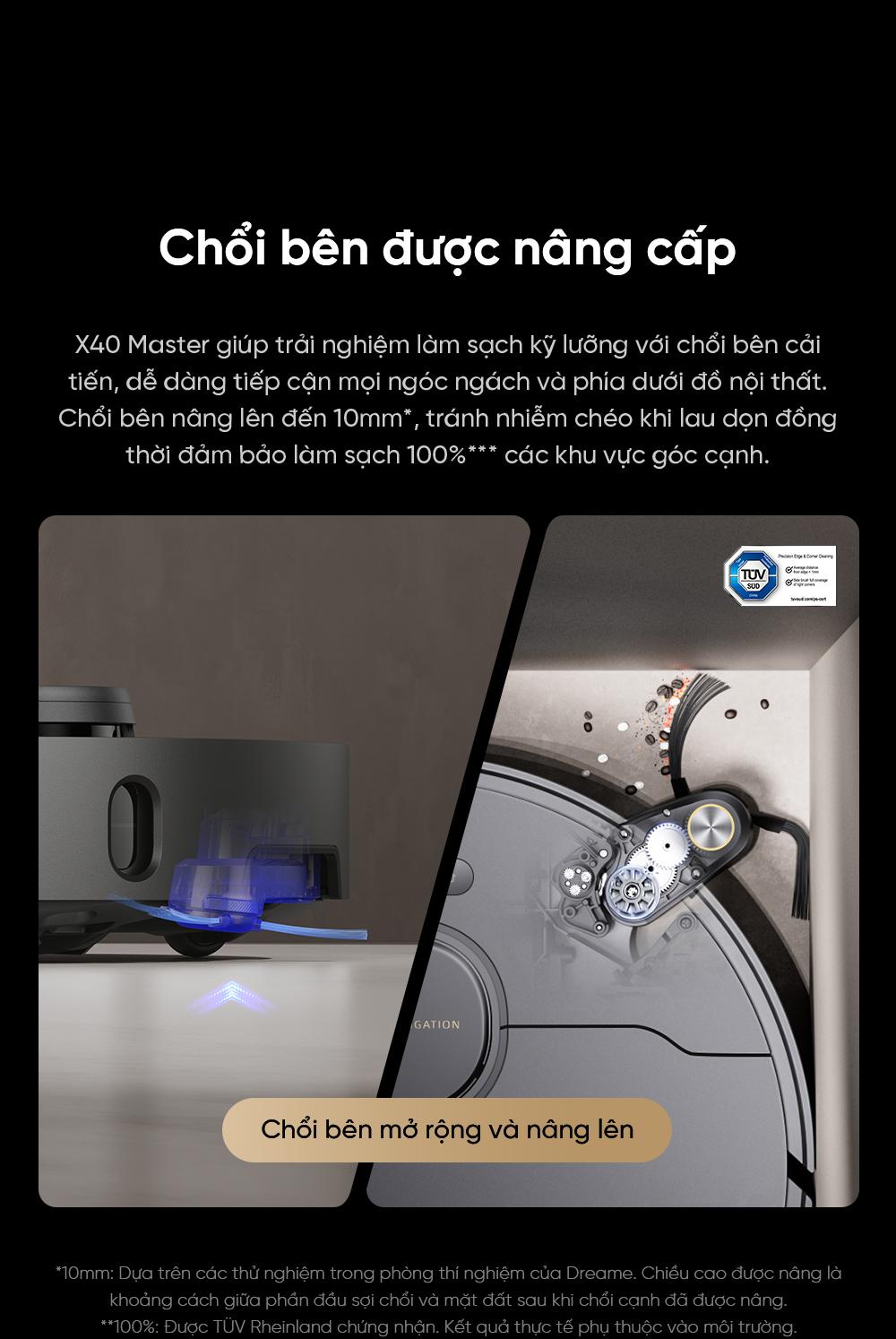 | Nâng chổi | Có, chổi chính tự động nâng 10.5 mm khi phát hiện thảm hoặc quay lại trạm |