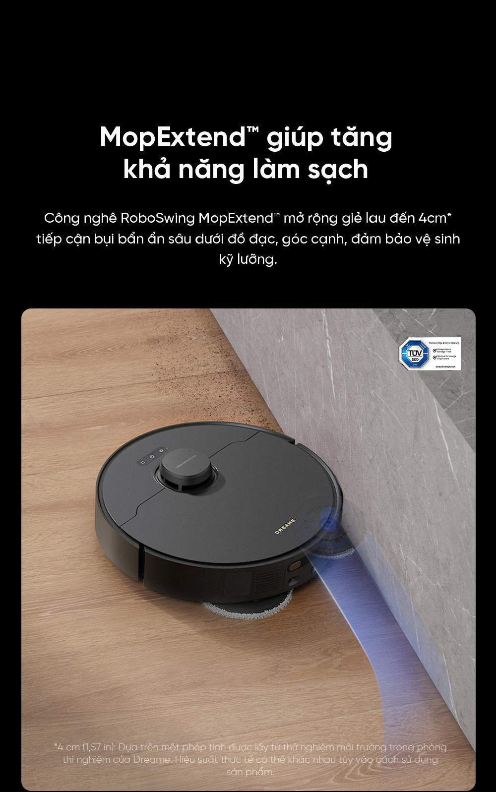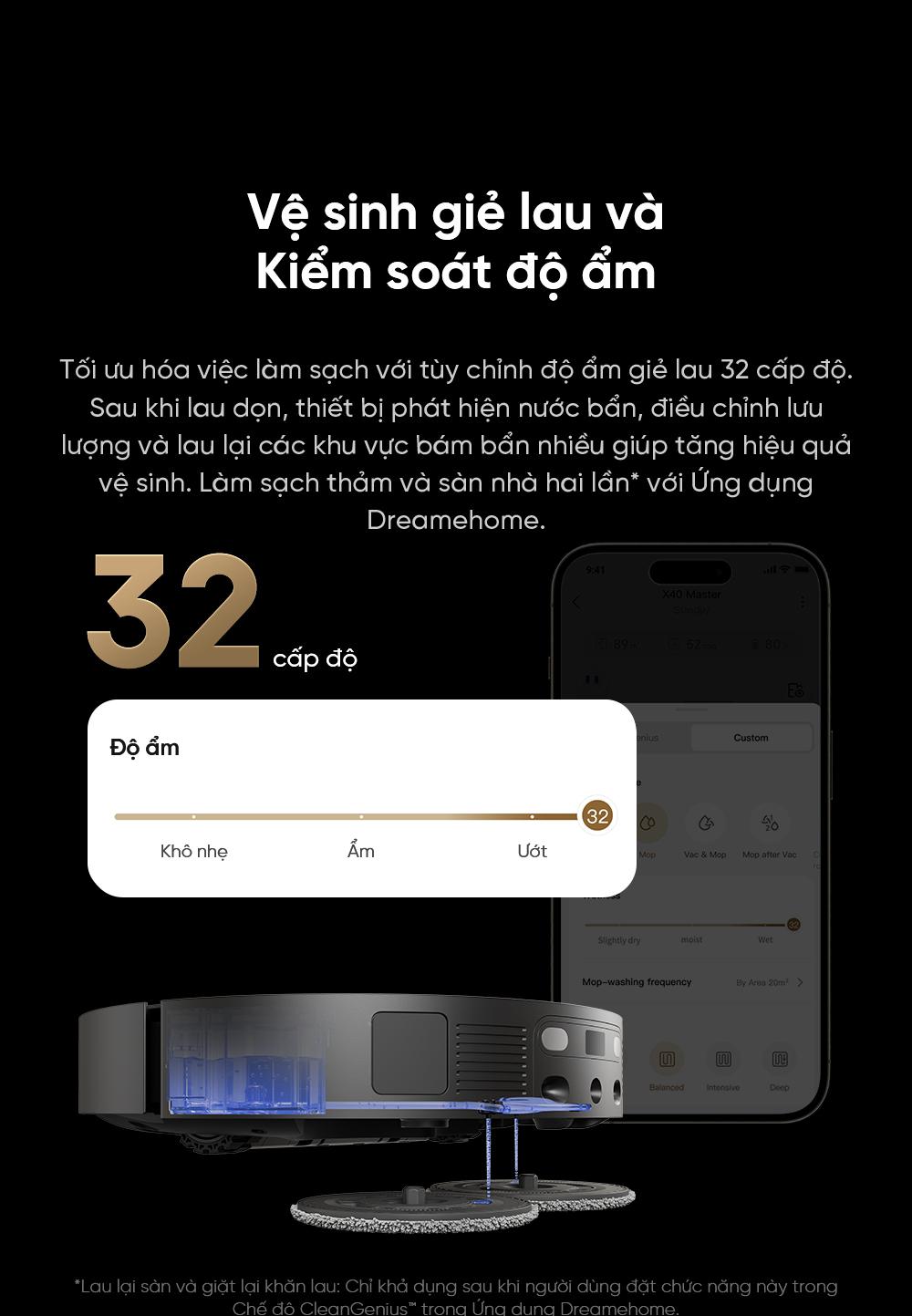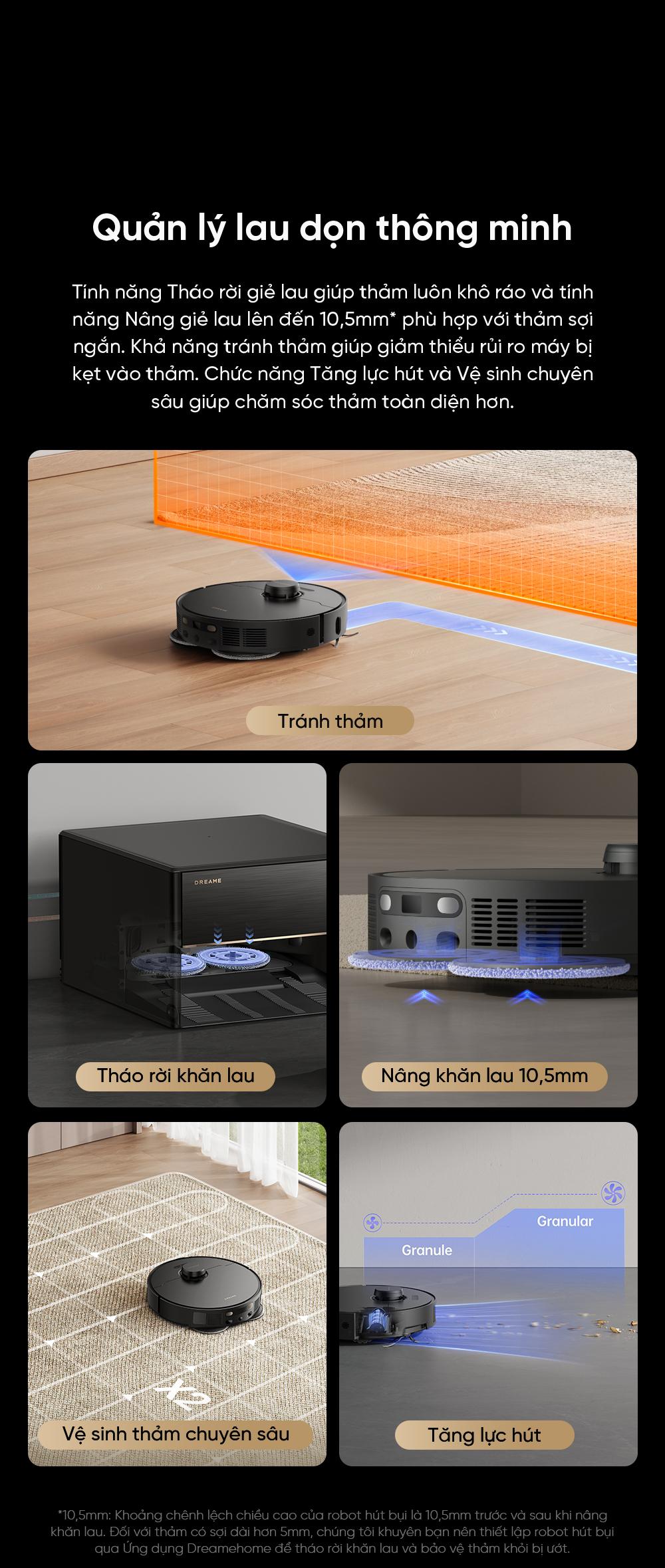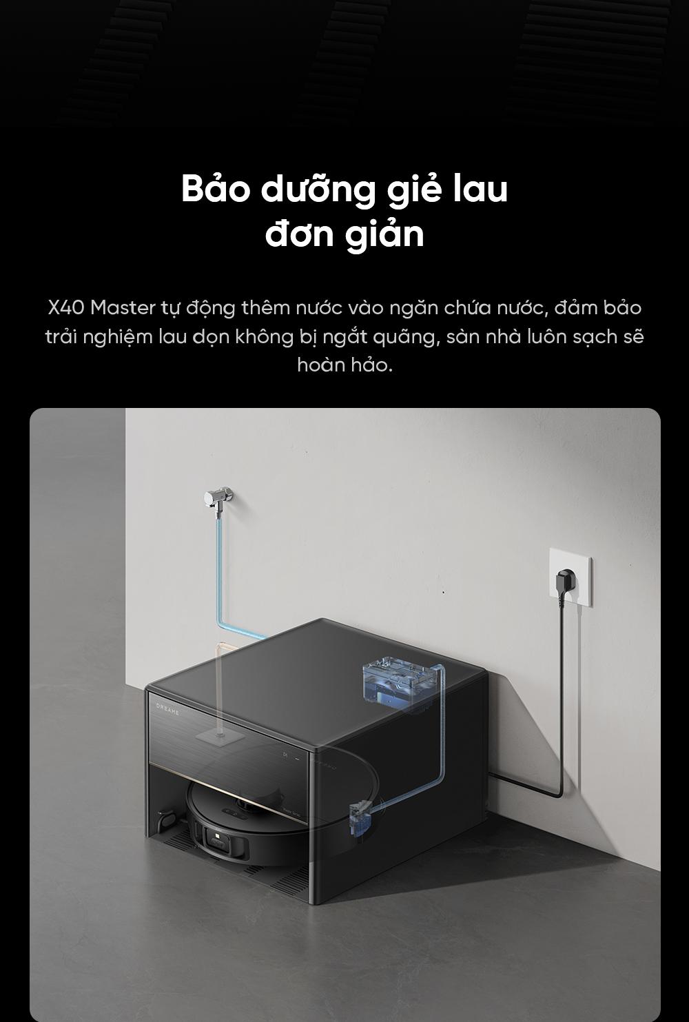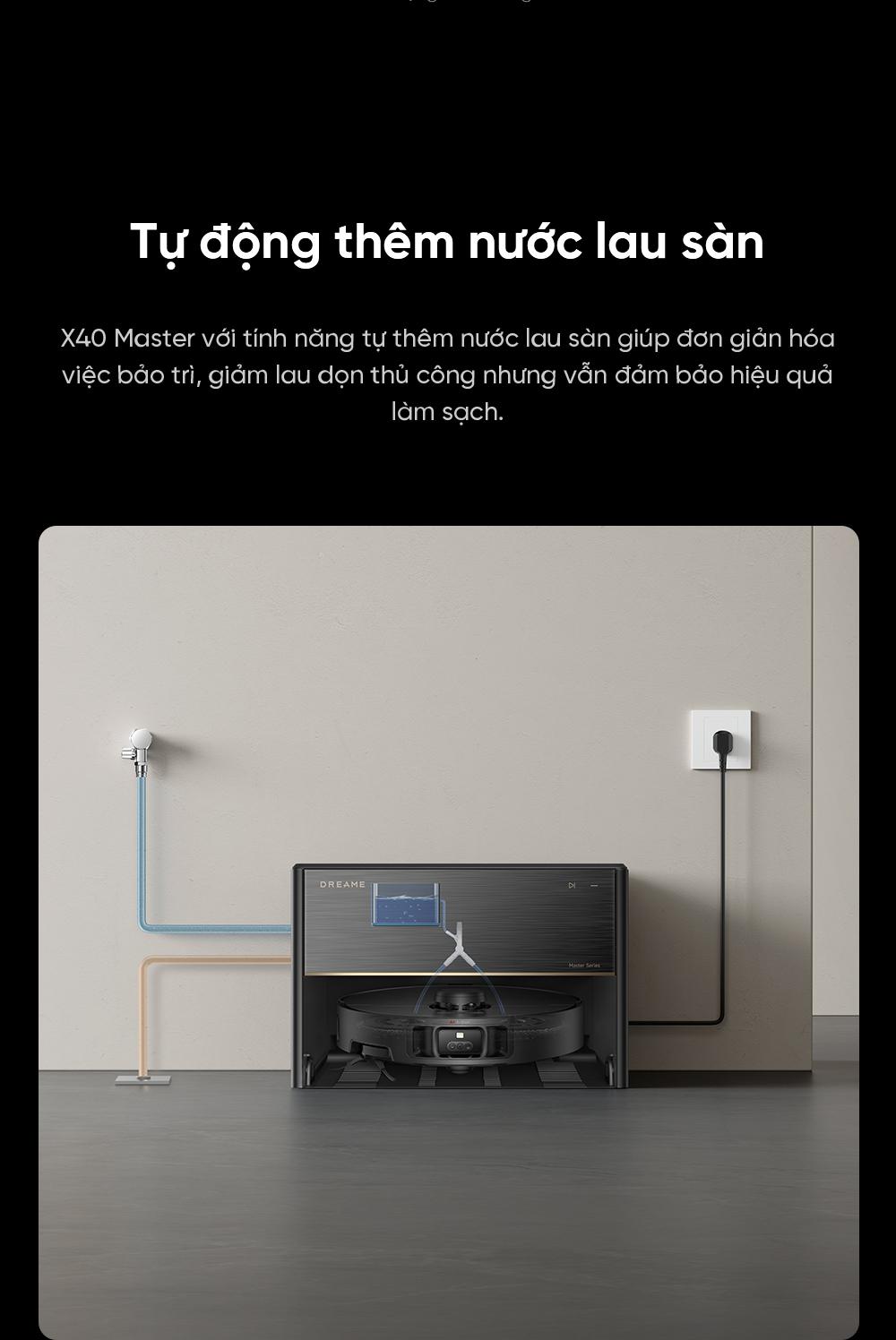 | Tự thêm nước lau sàn | Có, trạm tự động pha dung dịch nước lau sàn từ bình chứa riêng |