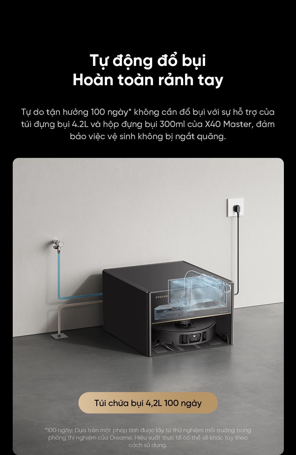 | Tự động đổ bụi | Có, hệ thống hút bụi tự động vào túi 2.5L tại trạm, không cần vệ sinh trong 75 ngày |