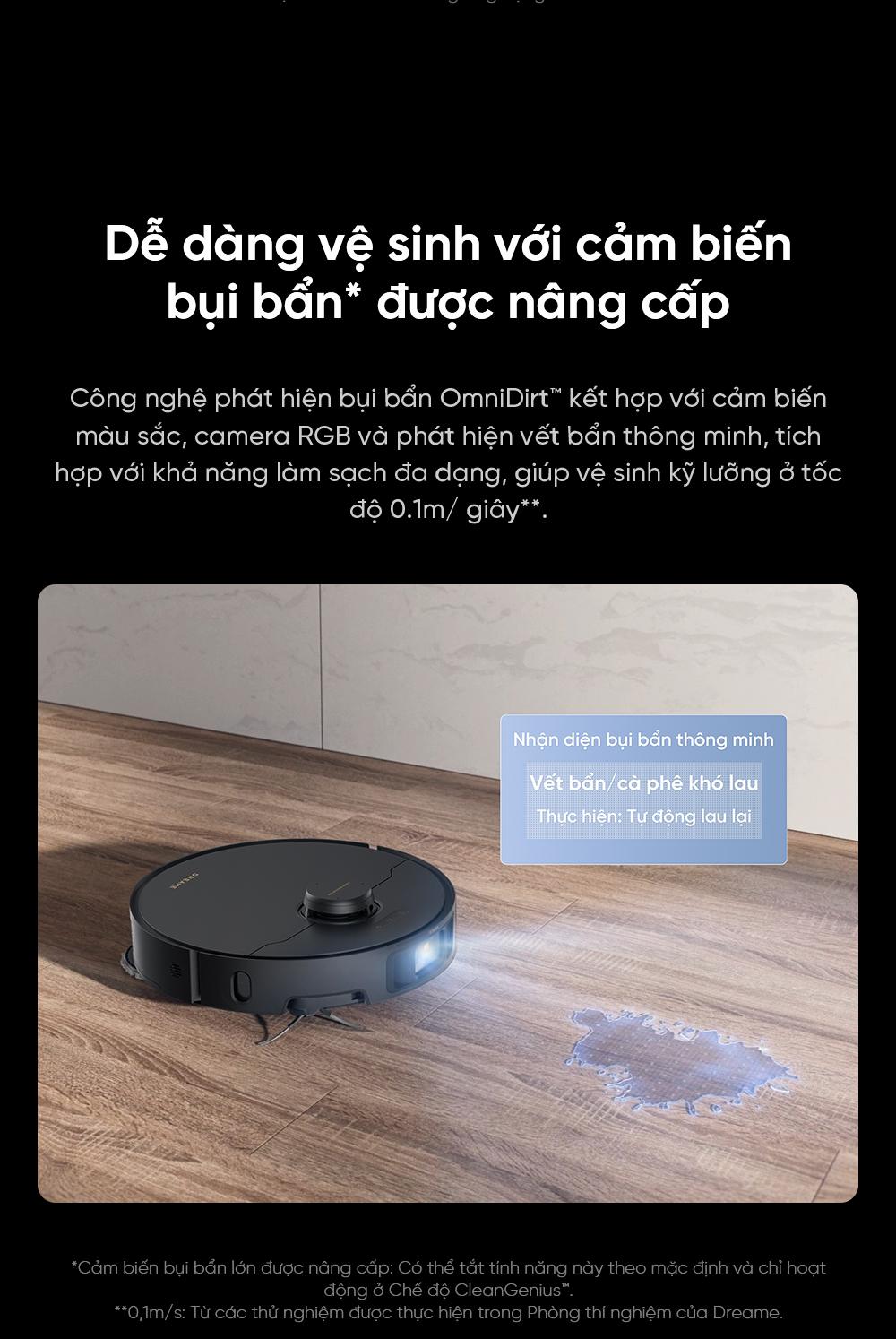 | Nhận diện bụi bẩn/ Giặt lại giẻ lau và lau lại sàn | Có, công nghệ DirtDetect™ nhận diện khu vực bẩn, tự động giặt lại giẻ và lau lại sàn khi cần |