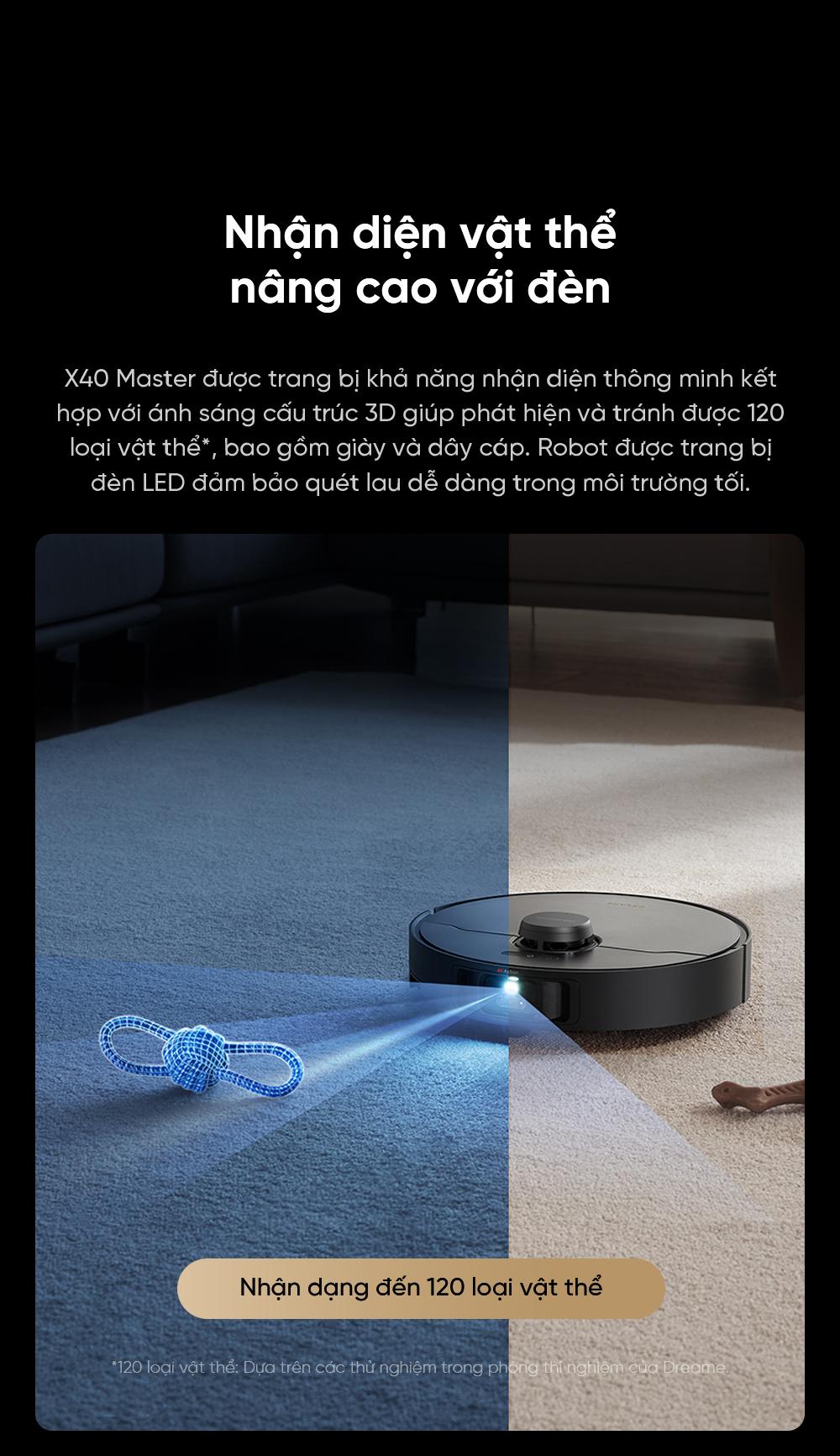 | Tránh chướng ngại vật | Công nghệ AI Action với 3D Structured Light và camera RGB, nhận diện hơn 80 loại vật thể, tránh chướng ngại vật hiệu quả trong cả điều kiện ánh sáng yếu. |